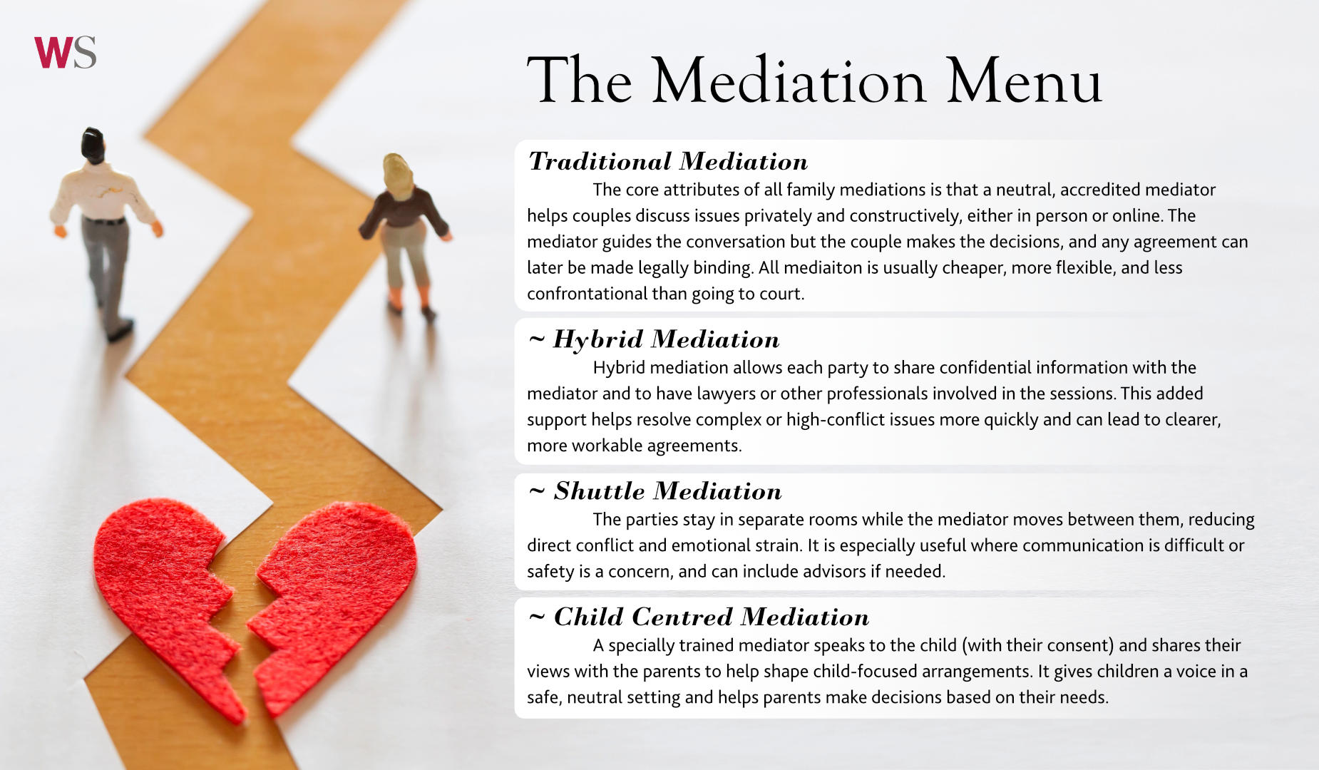 Every family’s situation is different, and the variety within the mediation menu ensures there is an approach to suit each one. By choosing the model that aligns with their needs—practical, emotional, or child‑focused—couples give themselves the best chance of reaching a balanced and constructive agreement.